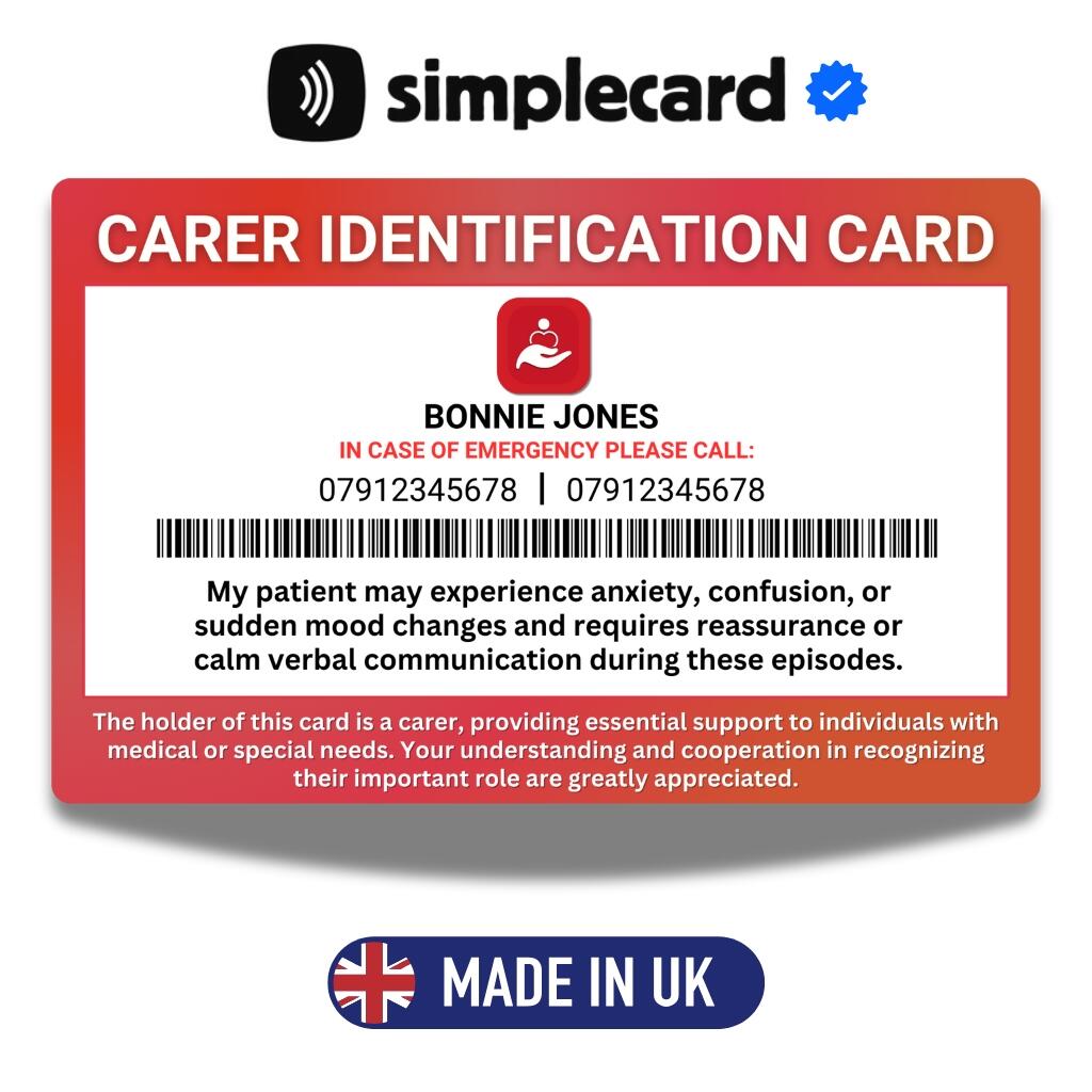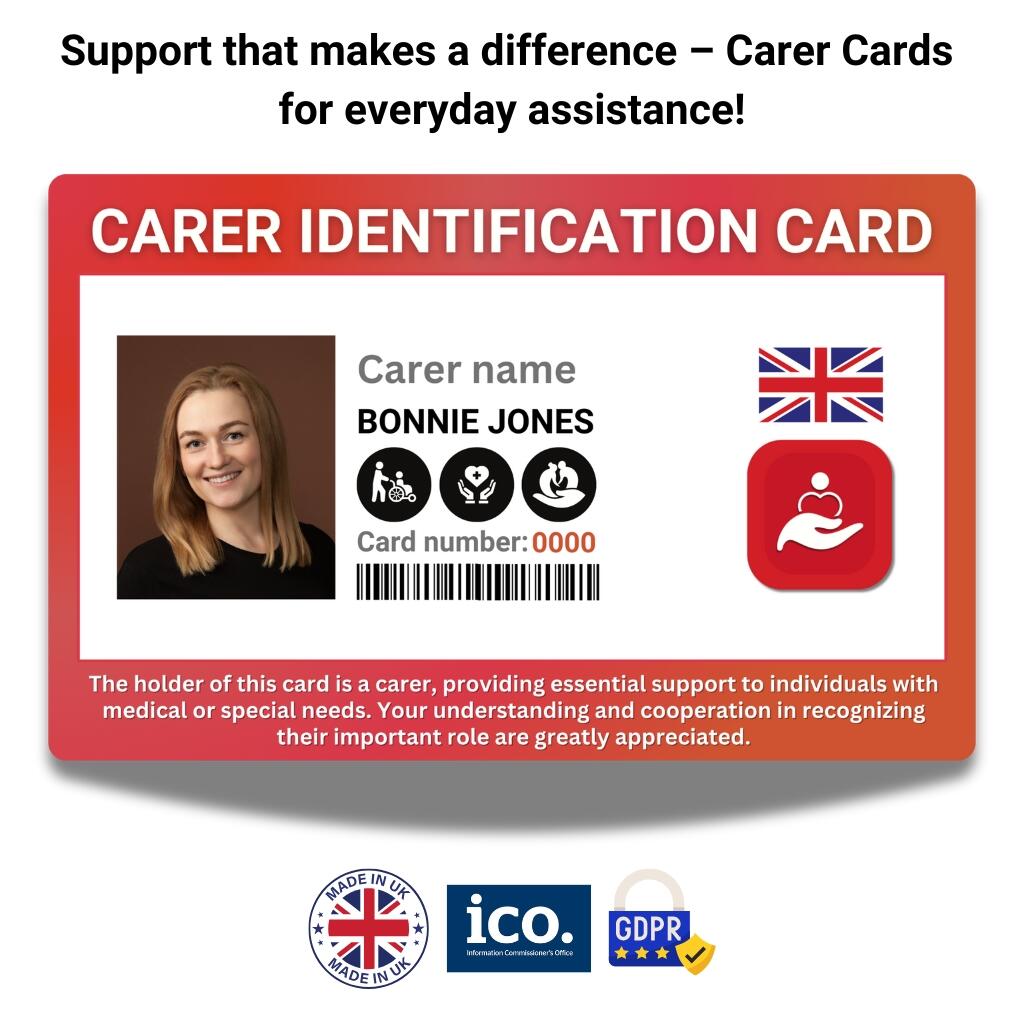How the card helps: Showing the card can quickly inform others, like staff or passers-by, of the carer’s role, ensuring they receive understanding and any necessary assistance.